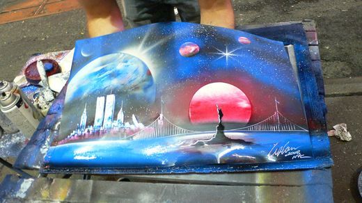 スプレーとスクレイパーだけで絵を描くというパフォーマンス